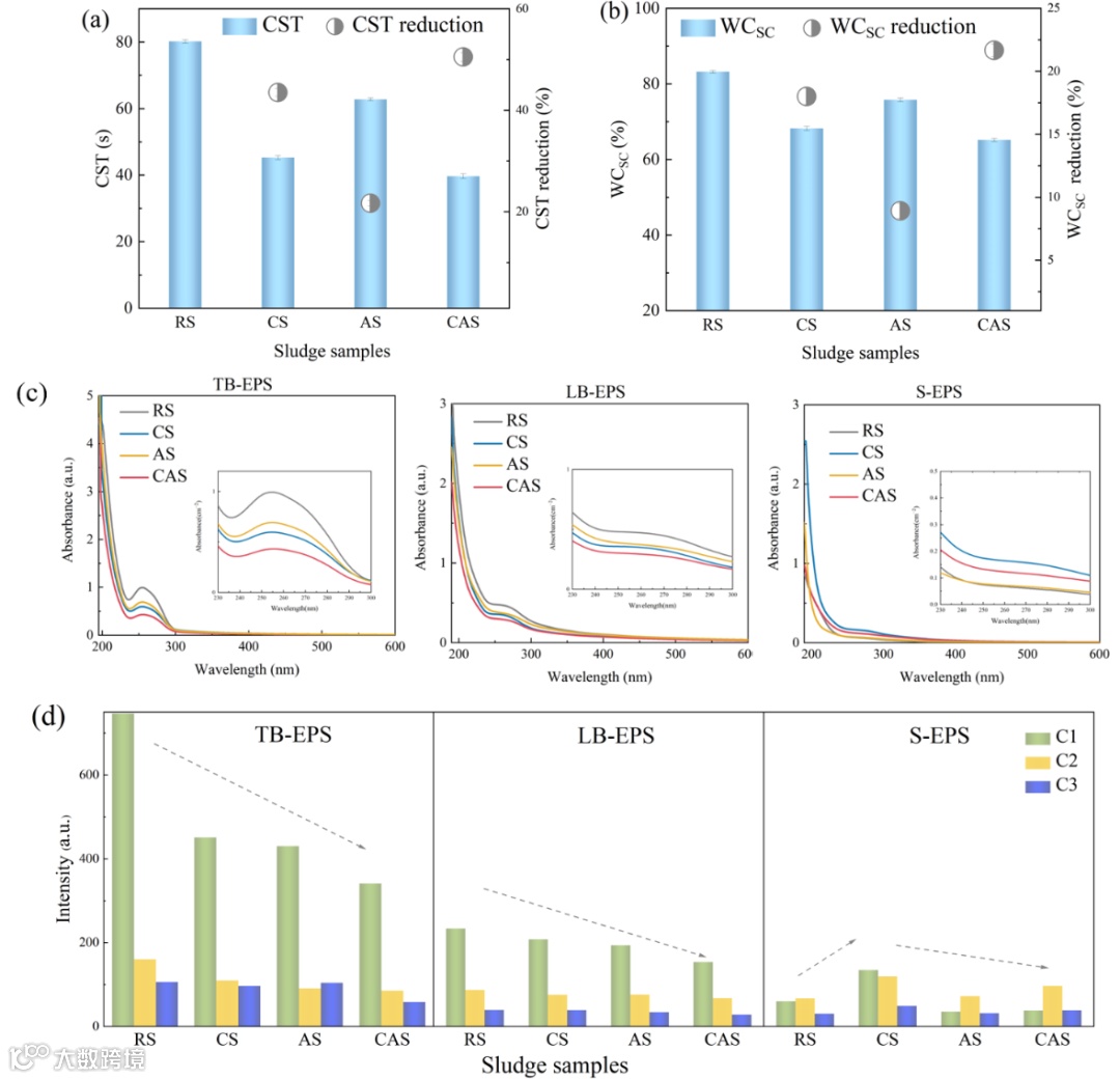 研究表明在孪生MFCⓅEFs处理过程中,污泥的脱水性能显著提升,泥饼含水率达到65.18%。污泥关键EPS组分的动态分布特征显示,可溶型EPS(S-EPS)的总体强度增加,而松散型EPS(LB-EPS)和紧密型EPS(TB-EPS)的强度在处理后均有所下降。根据紫外可见光谱(UV-vis)和三维荧光光谱(3D-EEM)分析,LB-EPS和TB-EPS中芳香族化合物(含C=Cand C=O双键)、色氨酸蛋白及腐植质类有机物含量降低,表明促进了泥水分离过程。其中,羟基自由基氧化和微生物代谢作用均可将固相中原本存在的难溶性高分子有机物和芳香族化合物转化为可溶性物质。区别在于,微生物处理会降解液相中的有机物并破坏固相中的EPS。