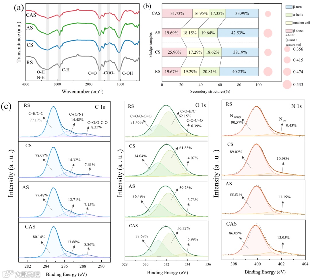 在孪生MFCⓅEFs处理过程中实现了较高的污泥降解程度,总化学需氧量和挥发性物质分别减少了59.85%和67.59%。傅里叶变换红外光谱(FTIR)分析发现,处理后污泥在与蛋白质和多糖相关的亲水性官能团(如酰胺I的C=O、酰胺II的C–N和N–H,多糖的C–O基团)处的峰值最小,表明有机大分子水解程度更高。较低的α-螺旋比例表明蛋白质结构变得松散并暴露出更多疏水位点。XPS光谱显示,处理后污泥中C-H/C-C(烃类物质)和C-(O/N)(醇、胺和酰胺基团)的强度降低,污泥降解程度增强,导致羧基增加而蛋白质或肽链减少。而Nnonpr向Npr的转化表明蛋白质水解并分解为更简单的形式。扫描电子显微镜(SEM)和共聚焦激光扫描显微镜(CLSM)图像显示,处理后的细胞外表不光滑,结构显著破坏,内容物流出,整体活细胞比例显著降低。