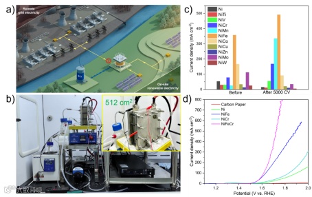这项工作证明可持续、非贵金属催化剂能够在千瓦级 AEMWE 堆中同时实现高本征活性和长期稳定性,并可直接由间歇性可再生能源驱动。通过结合机理洞察、合理的催化剂设计和在 2.5 kW 工业相关堆中的验证,该研究在基础科学和实际技术上实现了双重突破。