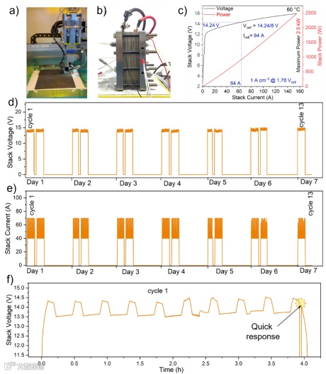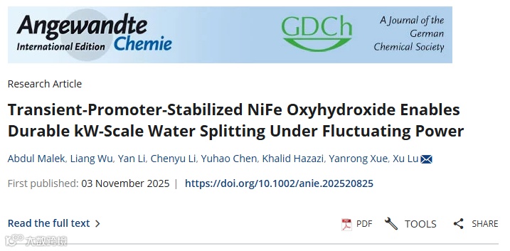 沙特阿卜杜拉国王科技大学(KAUST)卢旭教授团队,与上海电气、沙特阿美石油公司联合,在《德国应用化学》报道了一项突破性的研究:提出了一种瞬态助剂(transient-promoter)策略,促进镍铁(NiFe)氧氢氧化物催化剂的形成与稳定,从而实现千瓦级阴离子交换膜水电解槽(AEMWE)在波动电力输入下的可靠运行。在实验室规模下,体系在 80 °C 下仅需 1.68 V即可实现 1 A cm⁻2 的电流密度,并在恒定和波动负载下连续稳定运行超过 30 天。团队将1 cm2的单池放大到8个池子串联、总面积为 512 cm2 的 2.5 kW 电堆后,实现了在十三个模拟太阳能循环(>50 h)中依然能够稳定产氢的较高稳定性。具体而言,该千瓦级电堆在 60 °C 下实现 1 A cm⁻2、单池电压 1.78 V的性能,与实验室规模结果高度吻合。
