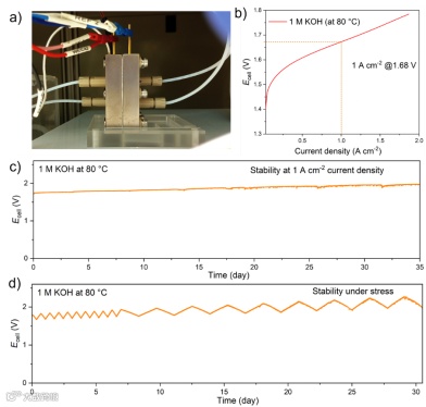 图 5 | 基于 Ni3Fe1.2Cr0.8Ox的实验室规模 AEMWE 的性能与运行稳定性。