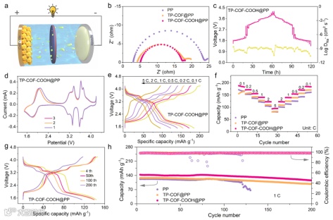 采用两步法合成:先通过1,3,5-三甲酰间苯三酚(TP)与2,5-二氨基苯二盐酸盐(Pa-OH)缩合生成TP-COF,再将丁二酸酐与TP-COF羟基反应引入羧基得TP-COF-COOH,最后将其与PVDF混合涂覆于PP隔膜两侧形成复合隔膜。设计核心为羧基功能化与COF有序结构协同,羧基增强电解质润湿性与Na+亲和性,COF规则孔道降低离子扩散阻力,共同保障钠离子均匀传输与稳定沉积。