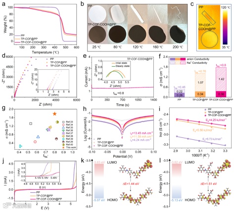 TP-COF-COOH@PP隔膜综合性能优异:电解质接触角低至6.5°、吸液率达242.5%,远超纯PP与TP-COF@PP;折叠扭曲后结构完整,600 ℃残留质量19.2%、200 ℃无明显收缩,热稳定性与机械性能良好;离子电导率1.78 mS cm-1、Na+迁移数0.8、交换电流密度13.45 mA cm-2、活化能4.25 kJ mol-1,可加速离子传输并降低沉积势垒,满足SMBs对隔膜的基础性能需求。