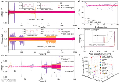 Na//TP-COF-COOH@PP//Na对称电池在1 mA cm-2下循环超2500 h(极化6.4-8.8 mV)、5 mA cm-2下循环超1500 h,远优于纯PP(220 h)与TP-COF@PP(1080 h),且不同电流密度下极化低、倍率适应性好;Na//TP-COF-COOH@PP//Na0.67Ni0.33Mn0.67O2全电池0.1 C下比容量185.0 mAh g-1、5 C下95.0 mAh g-1,1 C循环200次容量保持率80%、库仑效率近100%,显著优于其他两种隔膜,证实其优异电化学性能。