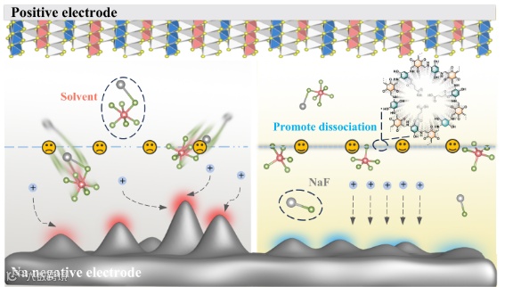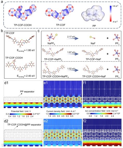 CV与GITT测试表明隔膜有序孔道与羧基功能化COF加速Na+传输,全电池Na+扩散系数达5.08×10-9 cm2 s-1;非原位XPS显示其诱导形成富含NaF的无机SEI层,机械强度高、阻抗低;DFT计算证实羧基增强Na+结合能(-2.40 eV)、降低NaPF6解离能(1.52 eV),FEM模拟表明有序孔道与离子-偶极相互作用实现均匀电位分布,共同揭示其通过优化离子传输与界面稳定性提升性能的机理。