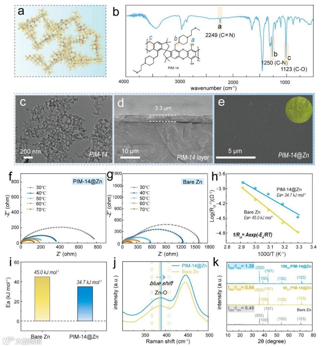 图2. a) PIM-14的分子模型。b) PIM-14的红外光谱。c) PIM-14的透射电镜图像。d) PIM-14膜的厚度。e) PIM-14@Zn的表面扫描电镜图像。f,g) 裸锌(f)与PIM-14@Zn(g)电极在不同温度下的电化学阻抗谱。h) 使用阿伦尼乌斯方程计算的两种电极的去溶剂化活化能。i) 两类电极活化能的对比。j) ZnSO₄电解质及其与PIM-14膜接触后界面区域的拉曼光谱。k) 循环不同时间后PIM-14@Zn负极的X射线衍射图谱。