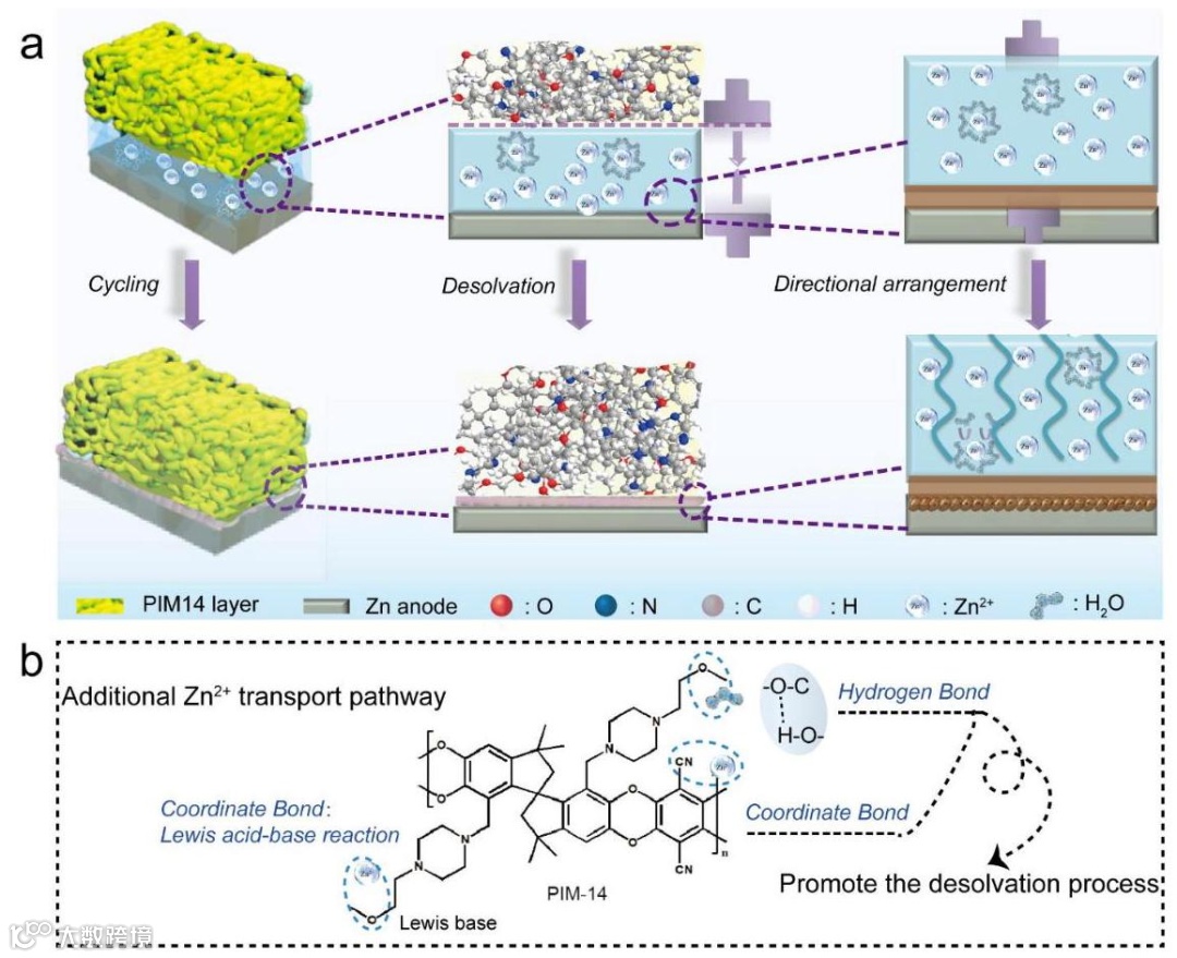 图1. a)PIM-14@Zn负极的沉积行为。PIM-14的自由体积骨架层加速去溶剂化并均匀化锌沉积,在首次循环中形成稳定的SEI保护层。b) PIM-14的功能机制。