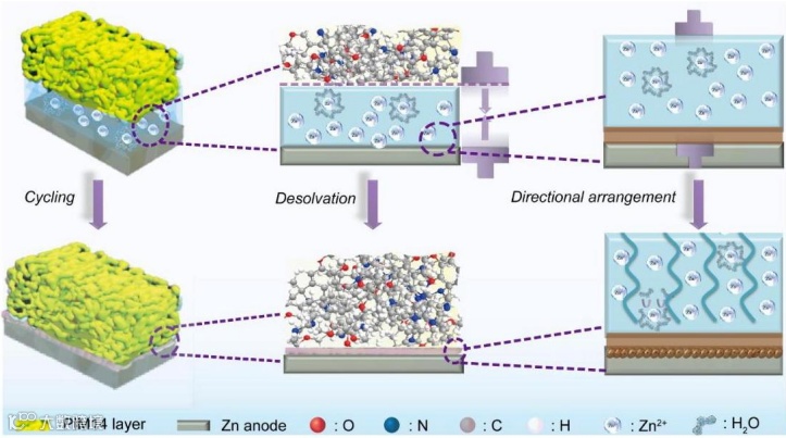 研究进一步通过分子动力学模拟从原子尺度揭示了作用机制:PIM-14的—C≡N基团与Zn²⁺强配位,启动初级去溶剂化;同时—O—基团通过氢键网络捕获水分子,实现次级去溶剂化,从而在电极界面形成扩展的脱水区,有效抑制了水相关的副反应。