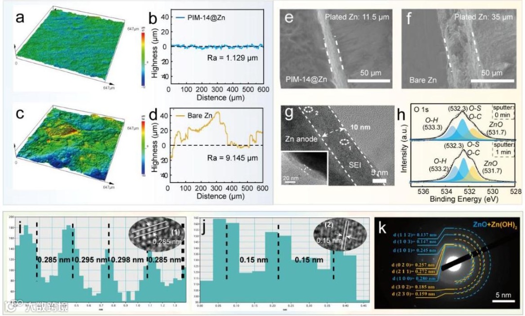 图3. a–d) 含/不含PIM-14的锌负极在循环150次后的激光共聚焦扫描显微镜图像(a,c)及相应的表面粗糙度曲线(b,d)。e,f) 循环150次后PIM-14@Zn(e)和裸锌(f)上锌沉积厚度的扫描电镜图像。g) PIM-14@Zn循环过程中形成的SEI厚度分布图。h) 经Ar⁺溅射0分钟和1分钟后生成的O1s深度分布谱。i,j) ZnO和Zn(OH)₂夹层的d间距线扫描分布,显示其平均层间距分别为0.285 nm和0.15 nm。(i)和(j)中的插图为ZnO和Zn(OH)₂的高分辨透射电镜图像。k) 从循环后PIM-14@Zn负极原位形成的SEI层获取的选区电子衍射图案。