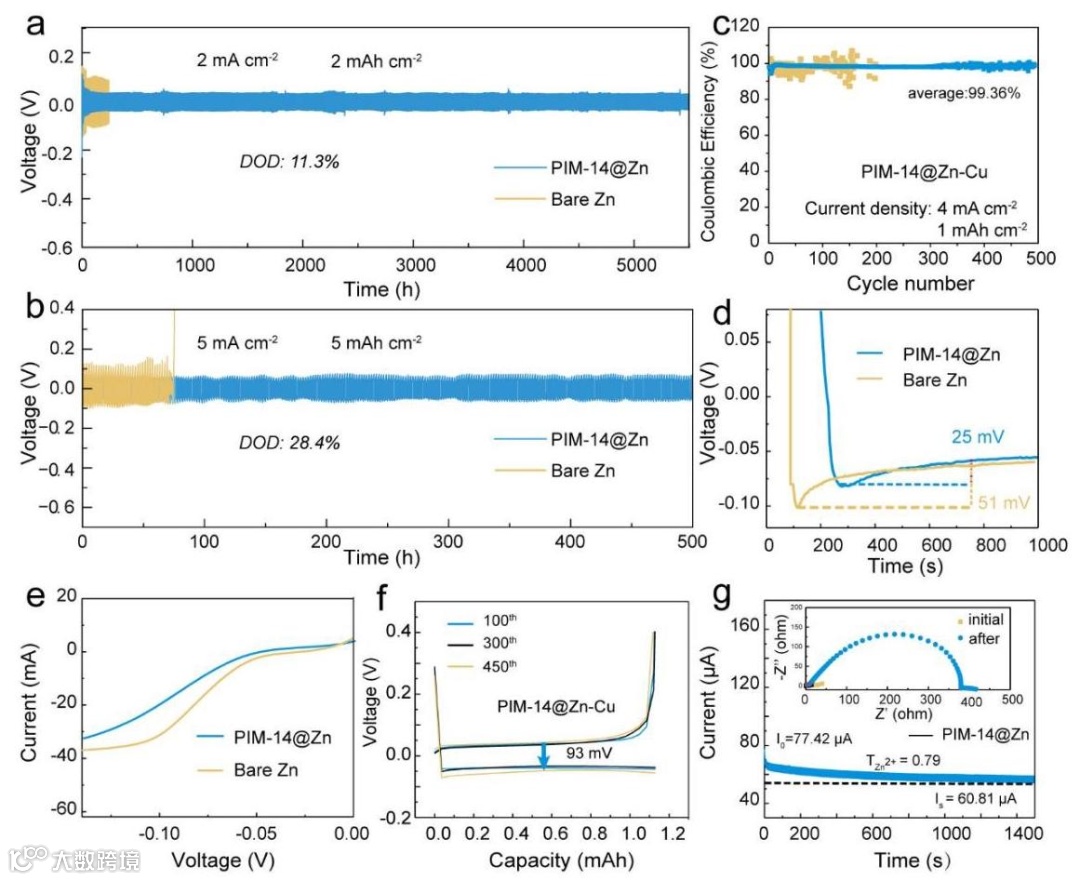 图5. 双重保护机制对锌离子电池电化学性能的影响。a,b) 在电流密度为2 mA cm⁻² (放电深度: 11.3%) 和5 mA cm⁻² (放电深度: 28.4%) 条件下,具有双重保护层的对称锌电池与裸锌箔的长期恒流循环性能对比。c) 由PIM-14@Zn和裸锌组装的非对称电池在4 mA cm⁻²和1 mAh cm⁻²条件下的长期库仑效率。d) 非对称电池的成核过电势。e) 比较PIM-14@Zn与裸锌电极析氢反应活性的线性扫描伏安曲线。f) PIM-14@Zn//Cu非对称电池在4 mA cm⁻²电流密度下不同循环的容量-电压曲线。g) 采用PIM-14@Zn的对称电池的电流-时间曲线。插图为极化前后的阻抗谱图。