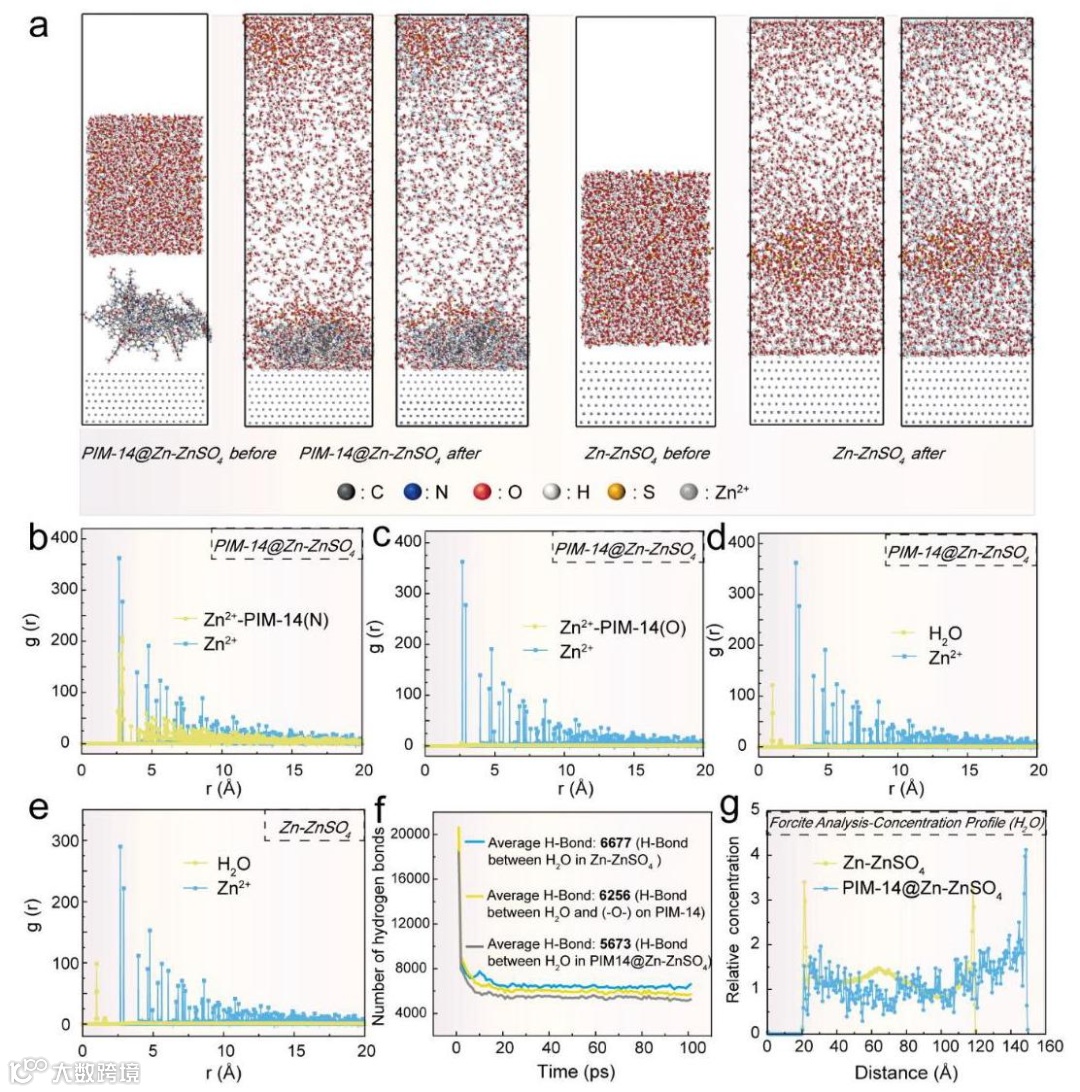 图4. a) PIM-14@Zn-ZnSO₄与Zn-ZnSO₄体系的模拟快照。b) PIM-14@Zn-ZnSO₄体系中Zn²⁺与N(来自PIM-14的—C≡N基团)的径向分布函数。c) PIM-14@Zn-ZnSO₄体系中Zn²⁺与O(来自PIM-14的—O—基团)的径向分布函数。d) PIM-14@Zn-ZnSO₄体系中Zn²⁺与O(来自H₂O)的径向分布函数。e) Zn-ZnSO₄体系中Zn²⁺与O(来自H₂O)的径向分布函数。f) 不同体系中水分子与PIM-14的—O—基团间氢键数量的分析。g) PIM-14@Zn–ZnSO₄和Zn–ZnSO₄体系中H₂O的密度分布图。