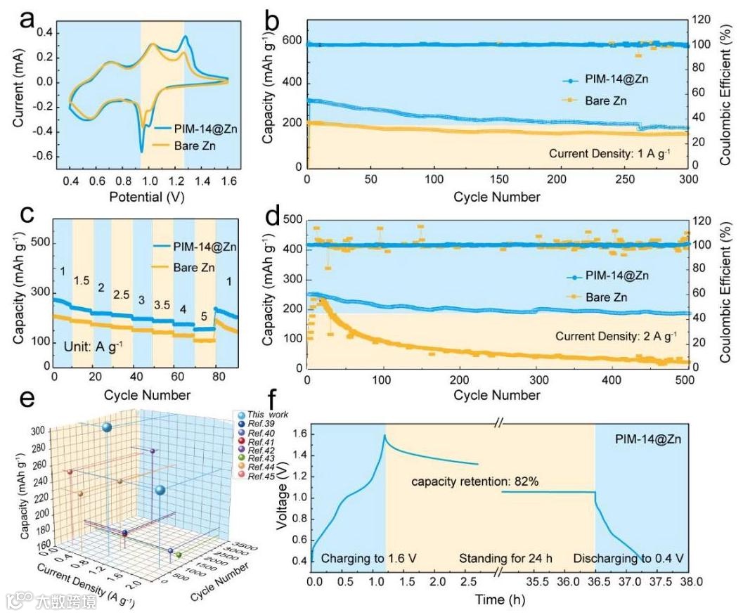 图6. PIM-14@Zn//V₂O₅全电池的电化学性能。a) PIM-14@Zn//V₂O₅与Zn//V₂O₅的循环伏安曲线。b) PIM-14@Zn//V₂O₅与裸锌//V₂O₅全电池在1 A g⁻¹电流密度下的循环性能对比。c) PIM-14@Zn//V₂O₅与裸锌//V₂O₅电池在不同递增电流密度下的倍率性能评估。d) PIM-14@Zn//V₂O₅与裸锌//V₂O₅电池在2 A g⁻¹下的长循环稳定性与效率保持率对比。e) 本工作中PIM-14@Zn//V₂O₅电池性能与已报道文献中基于钒氧化物正极电池的性能对比。f) 对组装好的PIM-14@Zn//V₂O₅电池在完全充电态静置24小时后进行完全放电,以评估其存储性能。