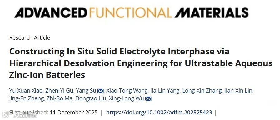 近日,来自东北师范大学吴兴隆教授与长春理工大学苏洋等人合作,在国际知名期刊《Advanced Functional Materials》 上发表题为“Constructing In Situ Solid Electrolyte Interphase via Hierarchical Desolvation Engineering for Ultrastable Aqueous Zinc-Ion Batteries”的研究论文。