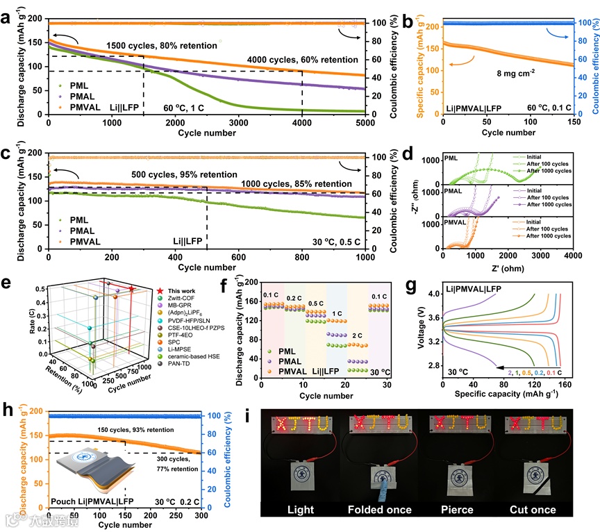 Li||LFP电池实现了60oC 5000圈和30oC 1000圈的优异长循环性能,并且在匹配8mg cm-2高负载正极时也有不错的表现。组装的软包电池在室温下能够稳定循环300圈,并且通过了破坏性测试,具备卓越的柔韧性与安全性。因此,本研究开发的PMVAL固态电解质具有开发高性能、高安全性全固态电池的巨大潜力。