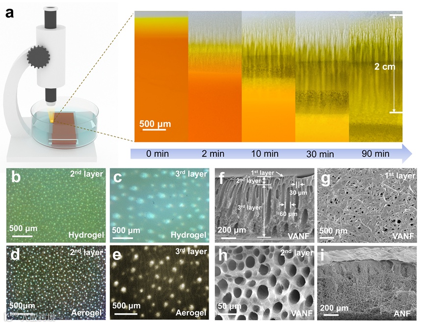 图2. 非溶剂诱导相分离工艺在芳纶纳米纤维气凝胶中制备垂直取向孔阵列的机理研究。