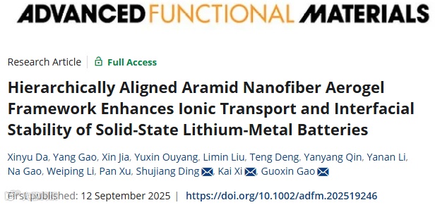 近日,西安交通大学的高国新副教授、郗凯教授、丁书江教授团队在国际知名期刊 Advanced Functional Materials上发表题为“Hierarchically Aligned Aramid Nanofiber Aerogel Framework Enhances Ionic Transport and Interfacial Stability of Solid-State Lithium-Metal Batteries”的研究论文。该研究论文聚焦固态电池的室温下的应用瓶颈,提出了一种新型固态聚合物电解质(简称PMVAL),其依托芳纶纳米纤维(ANF)气凝胶框架构建垂直排列的离子传输通道。