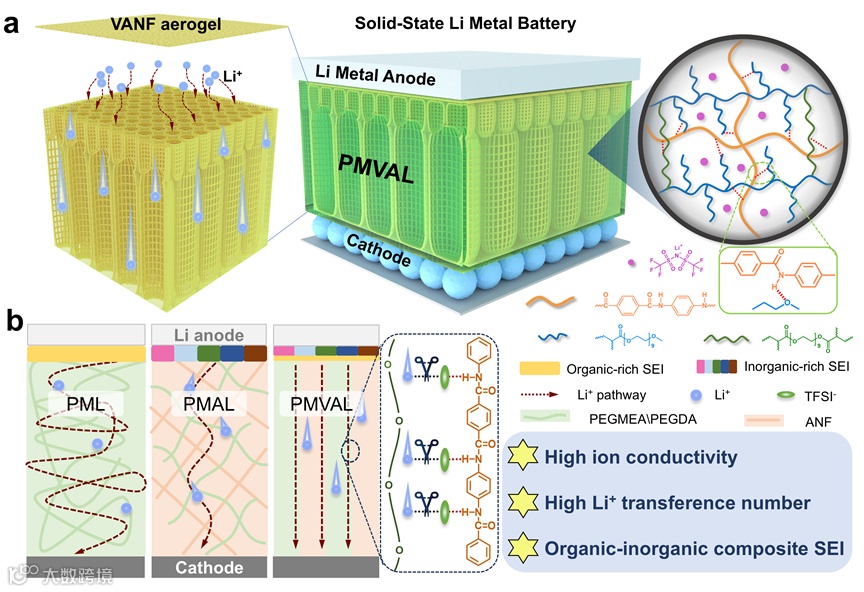 图1. 垂直取向芳纶纳米纤维气凝胶在采用PMVAL电解液的固态锂金属电池中多功能作用的示意图。