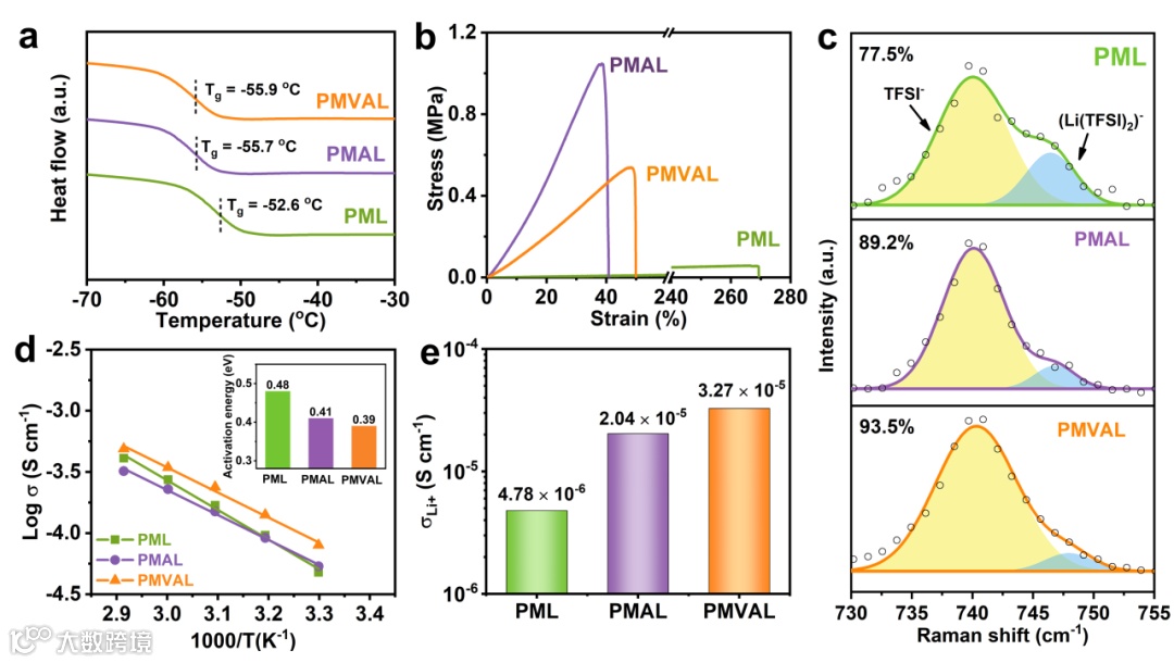 将聚乙二醇甲醚丙烯酸酯(PEGMEA)、聚乙二醇二甲基丙烯酸酯(PEGDA)交联剂和锂盐(LiTFSI)引入VANF气凝胶中,通过热引发自由基聚合获得与VANF的三维互穿网络。以EO短链作为侧链的三维网络有效降低了EO链的结晶,与VANF气凝胶的垂直取向离子传输通道协同作用,使室温离子电导率显著提升至0.82×10⁻⁴ S cm-1。此外,VANF气凝胶,能有效锚定TFSI-,提高Li+迁移数,帮助Li盐快速解离。VANF还能有效提高电解质的机械性能,并拓宽电压窗口。