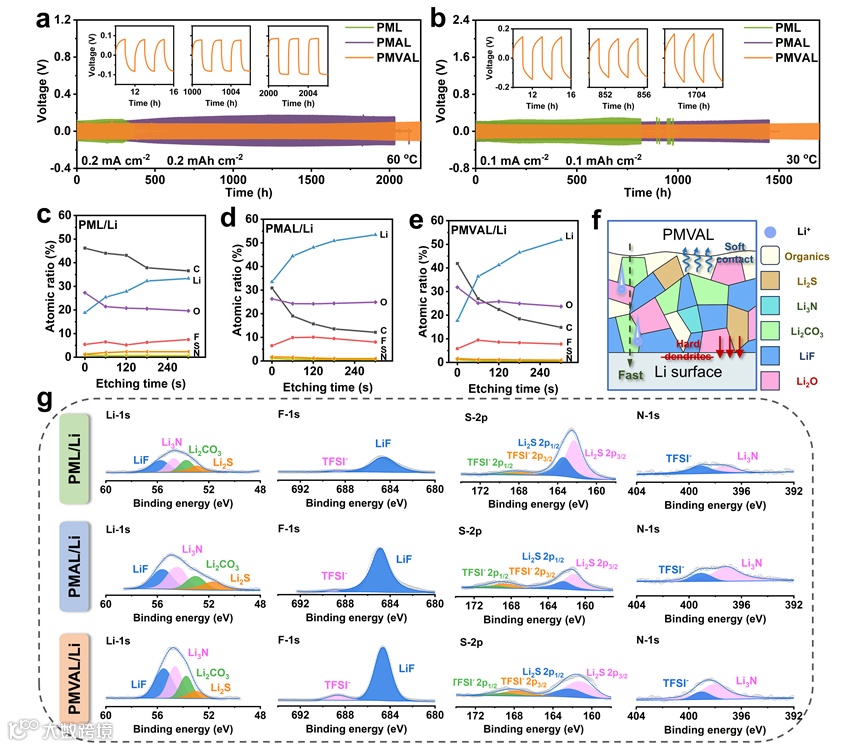 对固态电解质进行了锂对称电池测试,PMVAL的长循环稳定性和临界电流密度(CCD)均有显著提升。对Li/电解质界面进行射线光电子能谱(XPS)分析,表明VANF的特殊结构诱导Li/PMVAL界面形成了富有机-富无机双层固态电解质界面膜(SEI)。富有机外层实现和负极和电解质的良好界面接触,富无机内层实现快速的Li+传输和有效地Li枝晶抑制。
