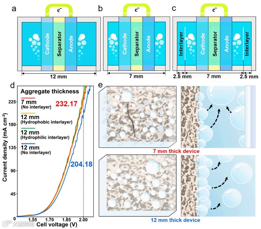 水电解是实现大规模可持续氢气生产的关键技术。然而,传统的水电解槽结构显示出较低的工作效率,无法满足日益增长的全球能源需求。其中一个重要但较少关注的性能限制因素便是电解槽运行时气泡在电极表面的形成和积聚,这些气泡不仅会遮蔽活性位点,还会妨碍电解质的传输,严重影响了装置的实际运行效果。目前,常见的气泡去除策略包括主动和被动两大类。主动法是通过引入新的动力源,如泵送、离心力、超声波或磁场等,直接地促进气泡的脱离和电解液的循环。但这一类方案会增加额外的能量消耗和设备复杂性,相对的,被动式方法因其自发加速气泡释放,更适合当今分散式、小型化的应用潮流。不过,常用的被动式方案如润湿性调控或分级微纳结构设计等又会带来新的制备工艺和实际应用可靠性方面的挑战。因此,如何尽量基于现有的成熟装置组件,在不增加额外能耗和工艺复杂度的前提下,同样实现内部气液流动的自我管理,成为当前水电解槽设计的一大挑战。