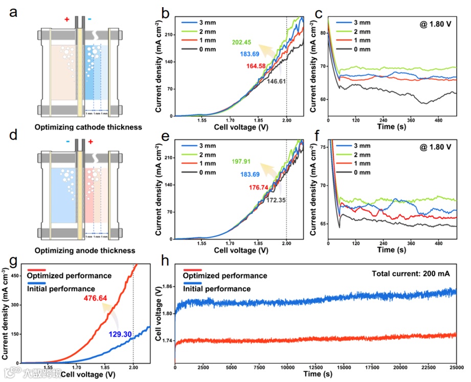 接着,我们进一步探索了这种空间限制效应的作用范围。经过对阴阳极侧电解室空间的初步调节,可以发现存在一个最优的设计区间,这暗示了空间限域效应中存在不同主导因素的变化,也为后续继续精细化设计提供了参考。经过简单的优化,装置就显示出极大的性能提升(如下图g和h所示),加之空间限域本身就可以进一步压缩整体装置的体积需求,这种紧凑高效的电解槽设计策略无疑具有巨大的应用潜力。
