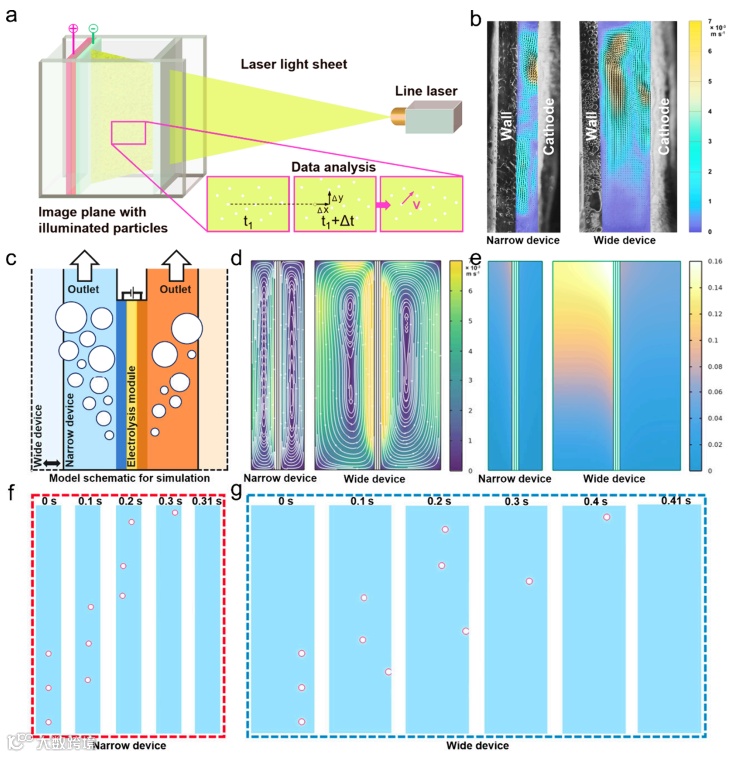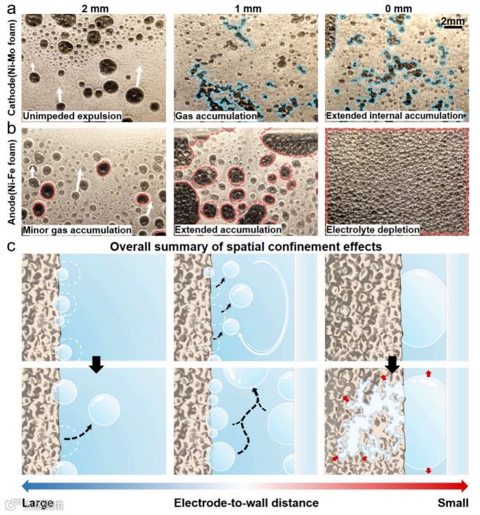 最后,通过总结上述所有的实验结果并结合全部结构装置运行时的光学观测图像,我们对空间限域效应的作用进行了初步的理解,大致可以分为三个阶段,如下图c所示:当电极距离壁面较远时,此时空间限域效应并不明显,气泡将经历成核、增长、脱离和排出的完整发展过程,仅有偶尔的气泡并聚和微弱的电解液流动会辅助它们的释放,因而在这一阶段,气泡将长久干扰电极反应并抑制整体的性能。随着电解室的压缩,受限的空间开始自发增强浮力引起的环流,加速了气泡的脱离和电解液的供应。另一方面,受限的空间还促进了气泡的合并和大片区域气泡的集体排出,进一步确保了可用的活性反应面积。最后,当壁面过于靠近电极时,气体倾向于集成大的气体团块并向电极内部侵入,严重阻碍了电解液的供应,导致传质阻力的增加和电解性能的迅速下降,形成新形式的气泡积聚问题。因此,空间限域的设计依赖于一种巧妙的平衡,以最大化装置运行过程中的自我调节作用。