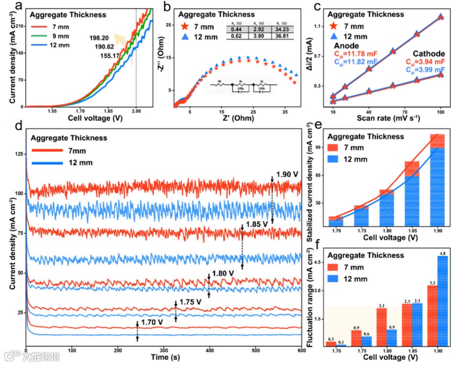 在此基础上,我们通过一系列电化学测试全面地考察了这种空间限域设计相比传统电解槽设计的性能特点。最主要的,在多种电极材料并控制本征电解性能(下图b)和活性表面积(图c)一致的情况下,经过空间限制的电解槽无论在暂态(图a)还是稳态(图d-f)运行时仍然都显示出更优越的性能,且在高电压运行时电流的波动范围得到极大抑制,显示出空间限域设计的广泛有效性,并初步将这种增益与气泡行为的变化关联起来。