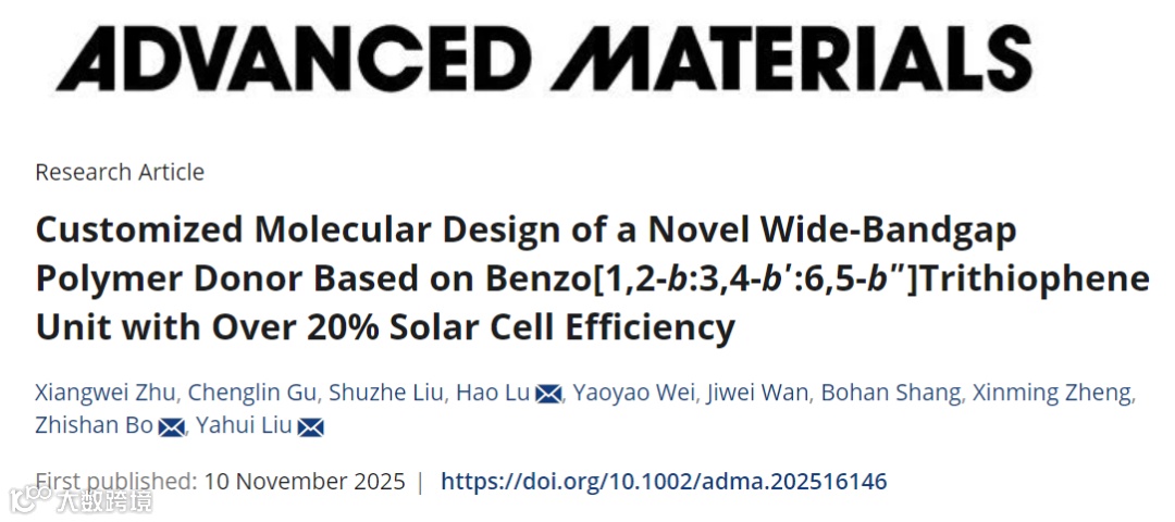 近日,来自青岛大学/北京师范大学的薄志山教授与青岛大学的刘亚辉教授、祝向伟教授和路皓副教授,在国际知名期刊Advanced Materials上发表题为“Customized Molecular Design of a Novel Wide-bandgap Polymer Donor Based on Benzo[1,2-b:3,4-b':6,5-b'']trithiophene Unit with over 20% Solar Cell Efficiency”的研究型文章。该文章设计、合成出了一种基于苯并三噻吩的全新吸电子单元,并由此构建出了一种高效的聚合物给体材料PBCE-2,最终在相应的有机太阳能电池中实现了高达20.4%光电转换效率。