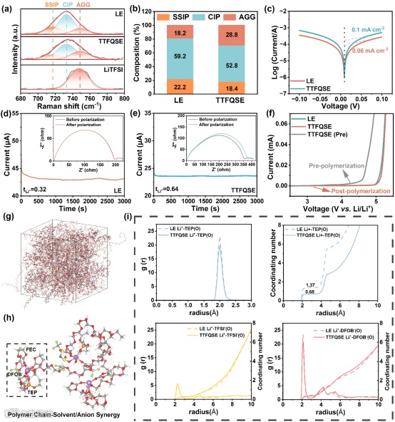 图2强调TTFQSE的离子传输机制和电化学性能,图 2a 的Raman光谱分析揭示了溶剂化结构: 718、732和749 cm-1处的信号峰分别对应分离离子对(SSIP)、接触离子对(CIP)和聚集体(AGG)结构。基于峰面积积分统计的组分比例如图2b所示,TTFQSE体系中SSIP比例(19.8%)低于LE体系(26.3%),CIP比例(51.4%)也低于LE体系(55.5%),而AGG比例则从18.2%显著提升至28.8%。CIP/AGG比例升高与SSIP比例降低表明,聚合物的引入改变了液相组分的分子结合状态,拉曼光谱中AGG的大幅提升证实了聚合物网络中离子结合作用的增强,聚合物链段通过协同诱导和调控Li+周围溶剂/阴离子的配位。图 2c 的Tafel曲线了证明TTFQSE更快的Li+动力学。图2e TTFQSE的Li+迁移数高达0.64,是LE的两倍(图 2d),突显了高效Li+传输。图2f 的线性扫描伏安法(LSV)曲线显示TTFQSE电化学窗口扩展至5V,聚合后抗氧化能力增强。分子动力学模拟(图2g-i)进一步证实,PTXE与增塑剂协同打破笼状结构,促进Li+快速迁移,这种高连续配位机制是性能提升的核心。