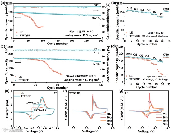 该要点展示TTFQSE在实际电池中的电化学表现。图6a 的50μm Li||LFP电池在0.5C下循环300次后容量保持率90.1%,远优于LE的快速衰减。图6c 的50μm Li||NCM622电池在0.3C下120次循环后容量保持率87.1%,初始放电容量169 mAh g⁻¹。倍率性能(图6b和图6d)显示TTFQSE在高倍率2C下仍保持149 mAh g⁻¹放电容量,而LE仅88 mAh g⁻¹。CV曲线(图6e)和dQ/dV分析(图6f-g)证实TTFQSE氧化还原电位差更小,表明更高可逆性,且循环中峰位移小,减轻了正极晶相畸变。这些结果验证了TTFQSE在高载量正极(LFP:12.3 mg cm-2;NCM622: 10 mg cm-2)和超薄锂负极(50 μm)条件下的稳定性。