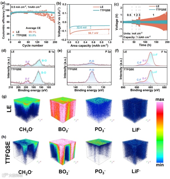 要点三重点分析TTFQSE对电极界面的稳定作用。图3a-b 的Li||Cu半电池测试显示,TTFQSE在0.5 mA cm-2下循环200次后库仑效率(CE)达92.5%,且成核过电位仅32.6 mV(低于LE的56.7 mV),促进锂均匀沉积。图 3d-f 的XPS谱图揭示,锂金属负极表面形成富磷和富氟无机SEI层,得益于聚合物-溶剂协同作用抑制了副反应。图3g-h通过飞行时间二次离子质谱(TOF-SIMS)深度剖析-3D成像去观测SEI具体成分(图3-18),分析CH2O-(有机成分)和BO2-、PO3-、LiF-(无机成分)的3D渲染立方体可以看出TTFQSE中SEI的有机组分随着深度的增加而逐渐减少,相反,在LE中有机组分的含量贯穿整个SEI层。有机成分SEI主要来源于溶剂的分解,在TTFQSE中由于聚合物对于溶剂的协同作用,使得更少的溶剂发生分解。在SEI无机物组分中,可以看出表面的信号强度均与表面XPS信号强度相对应。BO2-无机成分来源于LiDFOB,从结果看出TTFQSE相比于LE形成更薄且致密的含B无机物SEI成分。而PO3-来源于溶剂TEP,LE相比于TTFQSE具有贯穿的信号,说明LE中TEP对于锂金属是不稳定的,与锂金属反应容易形成蓬松的含磷无机物。而在TTFQSE中,通过聚合物与溶剂的协同作用,使得其在表面形成了致密的含磷无机物,而没有与锂金属发生反应。在LiF-信号中可以看出TTFQSE形成了含氟无机物SEI组分LiF。综上所述,TTFQSE的聚合物分子可以协同溶剂/阴离子形成含氟含磷的有机无机杂化SEI,主要以无极组分为主,并且可以调控SEI膜的构建形成更坚固的SEI成分,有助于锂金属负极的循环稳定。