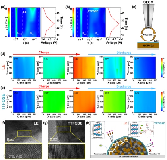 通过原位阻抗测试结合分布弛豫时间(DRT)分析技术可视化CEI形成过程。由于CEI的形成,首圈循环阻抗与荷电状态(SOC)的关联性更加复杂。如图5a所示,TTFQSE充电过程中RCEI持续降低,表明CEI形成初期锂离子迁移阻力减小,使Li+得以快速扩散,随循环推进CEI结构趋于稳定。而LE体系(图5b)的CEI阻抗始终较大,阻碍Li+快速迁移,循环过程中晶格畸变导致容量快速衰减。图5d显示LE体系在不同电压下的电流反馈信号:充电初期因正极表面缺乏明显CEI层,探针产生的离子可直接与活性物质反应,反馈信号较弱;随充电电压升高,电解液中溶剂分子与阴离子分解形成CEI层,阻碍离子扩散导致反馈电流升高;放电过程中LE体系不稳定的CEI引发反馈信号波动,反映界面局域异质性。而TTFQSE体系的NCM622电极在各阶段均呈现均匀的反馈信号分布(图5e),稳定的CEI层维持一致的反馈电流。LE体系中由于Li+在充放电过程中与TEP共嵌入NCM622晶格,经多次循环后引发不可逆晶格畸变,这也与图5f中TEM晶格图像相对应,这种结构失稳与CEI层破碎化、异质性直接相关,与SECM观测的非均匀反馈信号一致。而TTFQSE的反馈信号均匀。这些发现表明TTFQSE中致密均匀的CEI层为阴极提供强效保护,抑制长循环过程中的晶格畸变与结构退化(图5g)。这些结果表明,TTFQSE通过致密均匀的CEI层有效抑制了过渡金属溶出、晶格畸变及界面异质性(图5h)。