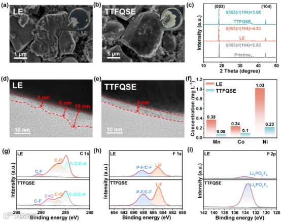 在正极界面方面,图4a-b的SEM显示TTFQSE循环后NCM622结构完好,而LE出现坍塌;图4d-e的TEM证实TTFQSE的CEI层均匀薄至4nm,而LE的CEI层不均匀。XRD测试(图4c)和 ICP分析(图4f)进一步表明TTFQSE抑制了过渡金属溶解,维持了晶相稳定性。通过XPS分析不同体系CEI的化学成分。C1s谱(图4g)显示C-C/C-H(~284.8 eV)、C-O(~286.4 eV)、C=O(~288.4 eV)和C-F(~290.6 eV)特征峰。相比LE体系,TTFQSE中C-O信号减弱并出现C=O信号,对应聚合物有机CEI层的形成,表明TTFQSE在正极表面构建了更强的有机CEI层。F 1s谱(图4h)中LiF(~684.8 eV)主要来源于LiDFOB和FEC的分解。由于C1s谱显示溶剂分解较少,LiF信号主要来自LiDFOB歧化分解产生的LiF组分,其含量增加有利于保护正极颗粒并稳定电极/电解质界面。与负极XPS结果类似,TTFQSE的P2p谱(图4i)出现含磷的强无机信号,这与SEI形成机制相似。基于强聚合物-溶剂/阴离子协同效应,TTFQSE使Li+在充放电过程中在界面处稳定嵌入/脱出NCM622晶格。TEP到界面脱溶形成了含LixPOyFz的无机CEI层,因此TTFQSE中形成了有机/无机杂化复合CEI成分。该复合CEI抑制循环过程中的晶格畸变,避免NCM622电极活性物质失活,确保优异的长循环稳定性。