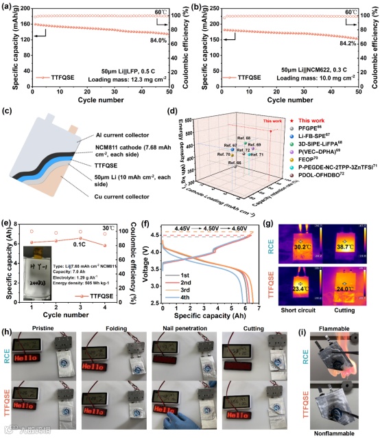 图7突出TTFQSE的实用性和安全性。图7a-b 的高温(60°C)测试显示,50μm Li||LFP和50μm Li||NCM622电池容量保持率在50圈分别为84%和84.2%,证明了该电解质的高温运行性。图7c-f 的大型软包电池(7Ah)采用双面超高负载量NCM811正极(单面载量40 mg cm-2)和50μm锂负极,实现了505 Wh kg-1的高能量密度和6.58 Ah可逆容量(性能比较见图7d雷达图)。安全方面,Figure 7g 的红外热成像显示,TTFQSE在短路和剪切测试中温升可忽略,而LE温升接近40°C。图h-i 的弯曲、针刺和燃烧实验证实,TTFQSE完全阻燃且无泄漏,LE则易燃爆炸。这些验证了TTFQSE在极端条件下的可靠性和商业化潜力。
