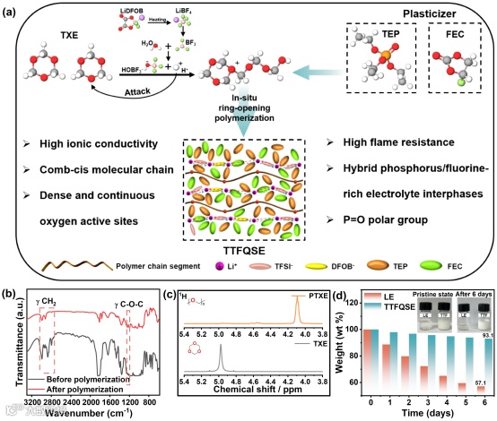 图1展示了高连续Li+配位准固态聚合物电解质TTFQSE的合成过程和初始性能验证。图1a 展示了制备机制示意图,显示锂盐引发剂(LiDFOB)热活化生成BF3,进而催化TXE聚合为PTXE。图1b为聚合前后的傅里叶变换红外光谱(FTIR),可验证聚合物开环聚合的成功。图 1c 的1H NMR谱图显示CH2峰从4.98 ppm位移至4.30 ppm,进一步确认TXE转化为PTXE。图1d 的挥发性测试显示,TTFQSE在氩气环境下重量损失远低于液态电解液(LE),表明其优异的溶剂锁定能力,这归因于聚合物骨架抑制了溶剂蒸发。这些结果为后续性能奠定了基础。