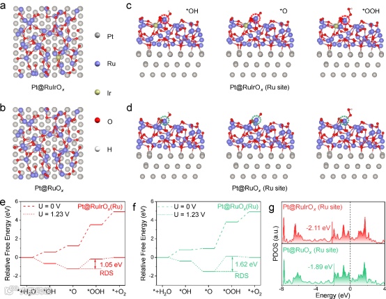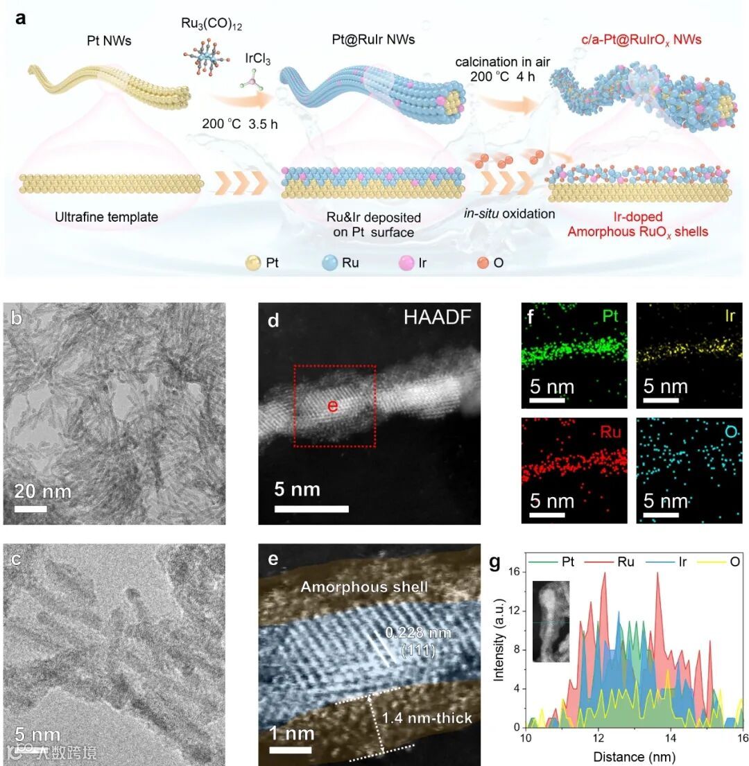研究通过表面原位氧化策略(图2a)成功在超细Pt纳米线(~1.0 nm)表面构建了平均厚度约1.6 nm厚的非晶RuIrOx覆盖层(c/a-Pt@RuIrOx NWs,图2c-e)。HAADF-STEM与EDS线扫分析(图2f-g)清晰揭示了这一核壳催化剂的元素分布,其中Pt集中于纳米线的内核,而Ru、Ir、O均匀分布于壳层区域,形成了具有结晶/非晶Pt@RuIrOx核壳纳米线。该策略攻克了在低维材料表面实现亚纳米级均匀非晶氧化物包覆层的合成难题,为设计新型非晶催化剂提供了普适性方法。