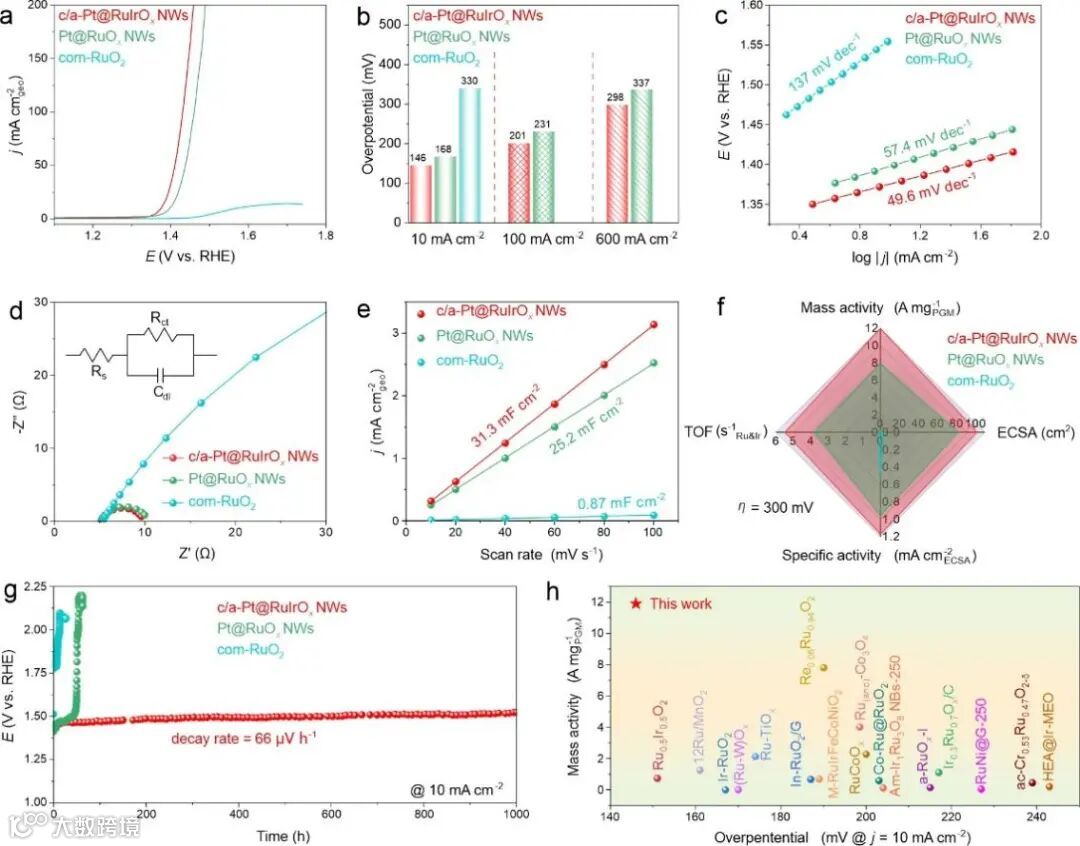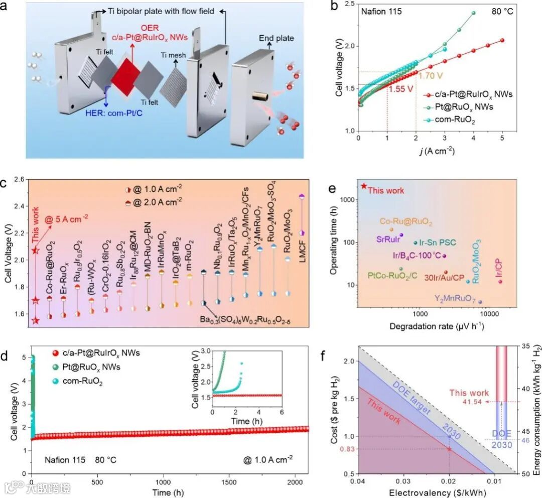 所制备的c/a-Pt@RuIrOx NWs在酸性OER中表现出优异的综合性能(图4):在10 mA cm−2电流密度下过电位低至146 mV,并能在10 mA cm−2下稳定运行超过1000小时,衰减率仅为66 μV h−1。更重要的是,在实际PEMWE电解槽中,于1.0 A cm−2的安培级电流密度下仅需1.55 V槽压,并可稳定运行超过2000小时(图5b, d)。同时,经济性分析表明(图5f)其在1.0 A cm−2下的制氢能耗低至41.54 kWh kg−1 H2,预估制氢成本为$0.83/kg H2,优于美国能源部2030年技术目标,展现出商业化应用潜力。