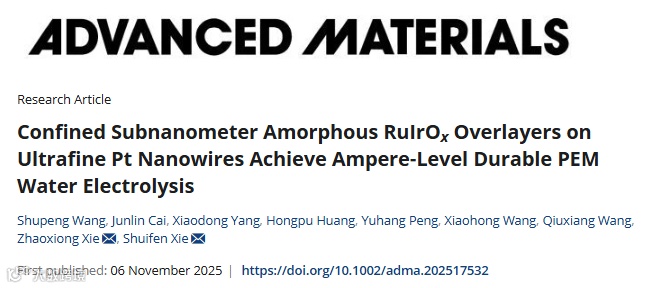 近日,华侨大学谢水奋教授联合厦门大学谢兆雄教授在国际知名期刊Advanced Materials上发表题为“Confined Subnanometer Amorphous RuIrOx Overlayers on Ultrafine Pt Nanowires Achieve Ampere-Level Durable PEM Water Electrolysis”的研究论文。该文章围绕质子交换膜水电解中阳极催化剂高活性与长期稳定性不可兼得的核心挑战,通过一种创新的原位氧化策略,首次在超细Pt纳米线上精准构筑稳定的亚纳米非晶RuIrOx活性层。研究表明,该催化剂利用Ir掺杂稳定了非晶结构,不仅实现了146 mV的超低过电位,更在安培级电流密度下获得超过2000小时的出色稳定性。机理研究表明独特的非晶表面能协同激活多重反应路径和晶格氧自修复能力。该项成果表明表面非晶相工程是设计兼具高活性与高稳定性电催化剂的有效范式,为推进下一代高性能电解水技术提供了新的催化剂设计途径。