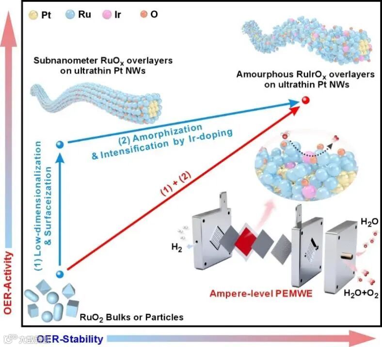 超细Pt纳米线上包覆亚纳米非晶RuIrOx活性层实现安培级超长寿命PEM水电解
