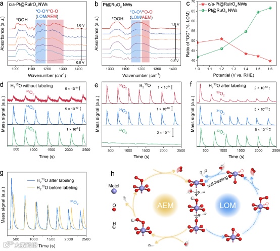 通过原位红外光谱和原位电化学差分质谱(图6)与理论计算(图7),揭示了性能提升的微观机理:独特的非晶表面结构协同激活了AEM与LOM乃至OPM等多重反应路径,实现了反应机制的动态互补。同时,研究观测到催化剂具备独特的晶格氧自修复能力,这有效抑制了由氧空位累积导致的结构衰变,是其卓越稳定性的重要原因。
