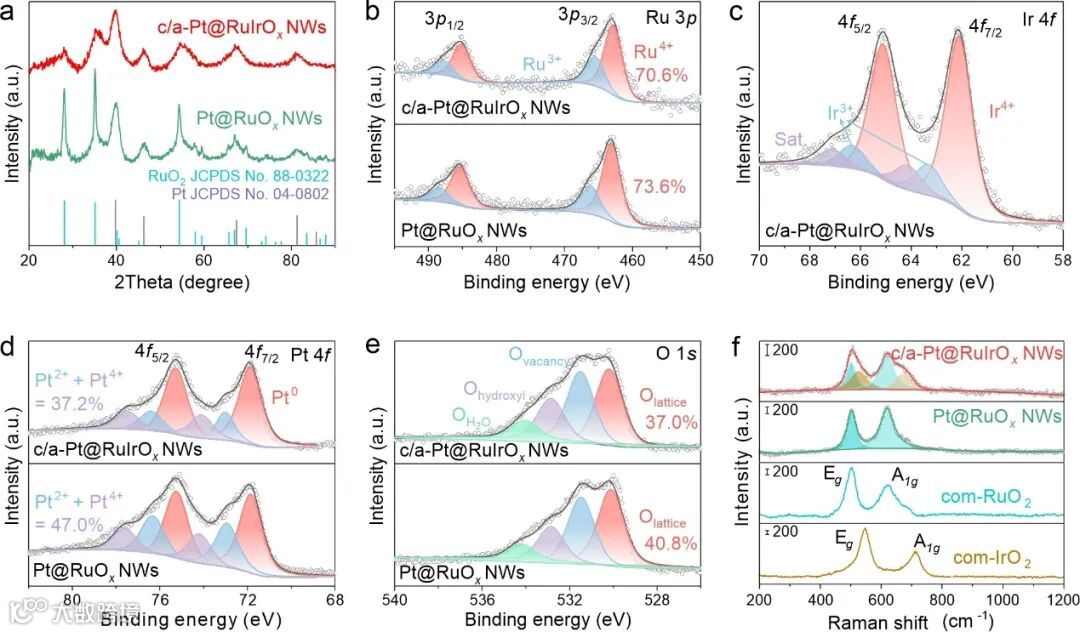 XRD图谱(图3a)显示Ir掺杂显著宽化并减弱了RuO2的结晶衍射峰,表明其长程有序性被破坏。拉曼光谱(图3f)进一步显示,相较于Pt@RuOx NWs,c/a-Pt@RuIrOx NWs的特征峰强度显著降低且出现Ir–O特征峰,证实了Ir–O键的形成及结构的无序性,这与非晶结构的形成和Ru–O共价性的减弱相一致。XPS分析(图3b-d)进一步表明,Ir的引入降低了Ru4+比例(70.6% → 73.6%),削弱了Ru–O共价性,并引起Pt电子的向外转移(Pt 4f结合能正移),这有利于提升了催化剂的抗氧化与抗溶解能力。