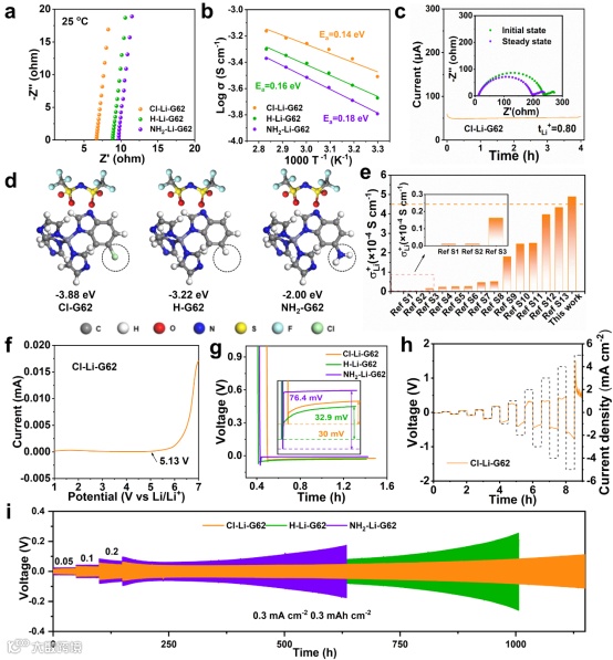 图2. 25 ℃时的Nyquist图;b) Cl-Li-G62、H-Li-G62和NH2-Li-G62的电导率随温度变化图;c) Li|Cl-Li-G62|Li对称电池的电流-时间曲线(插图:初始和稳态EIS);d) TFSI−与Cl-G62、H-G62和NH2-G62的结合能;e) Cl-Li-G62与已报道的MOF基电解质的𝜎Li+比较;f)Li|Cl-Li-G62|ss电池的LSV;g)Li|QSSE|Cu的电压分布图;h)不同电流密度下的电压响应;i)Li|QSSE|Li对称电池镀/剥离Li的循环稳定性。