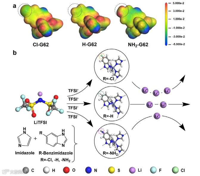 图1. a)不同取代基(R =-Cl,-H,-NH2)配体对ZIF-62玻璃的静电势图;b)拥有不同电子诱导效应的Cl-G62、H-G62、NH2-G62对锂离子传导影响示意图。