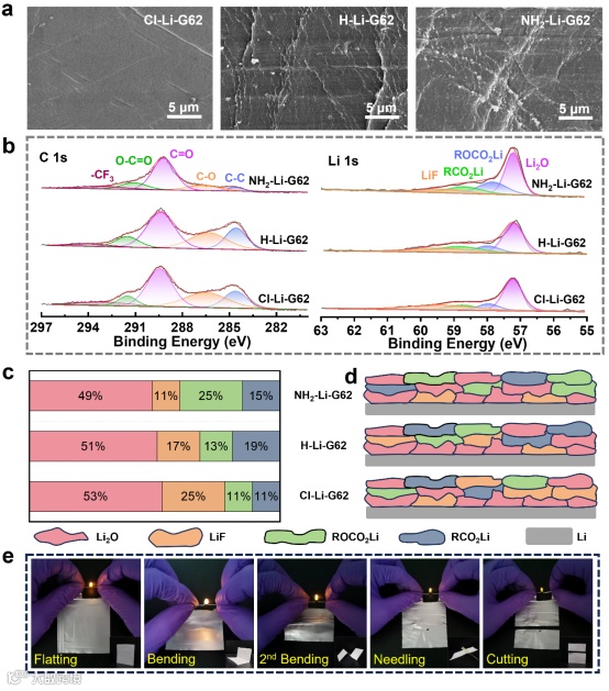 图 4. a) Cl-Li-G62、H-Li-G62和NH2-Li-G62的Li负极SEM图像; b) 循环锂负极上SEI层的C 1s、Li 1s高分辨率XPS光谱; c) LFP|Cl-Li-G62|Li中三个SEI层中LiF、Li2O、ROCO2Li和RCO2Li的组成含量; d) 相应的SEI组成模型; e) 滥用条件下LFP|Cl-Li-G62|Li软包电池。