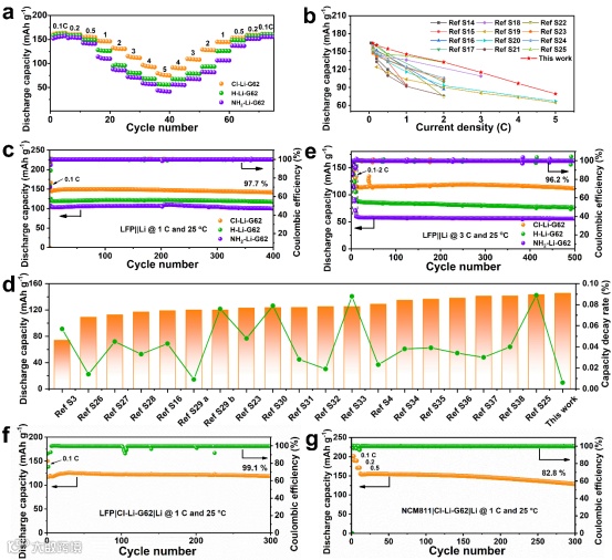 图 3. a) LFP|QSSE|Li的倍率性能;b) Cl-Li-G62与其他MOF基电解质的倍率性能比较;c) 和e) LFP|QSSE|Li在1C和3C下的循环稳定性;d) 比较不同MOF基电解质在1C下的比容量和相应的每循环平均容量衰减率;f)LFP|Cl-Li-G62|Li在空气中暴露7天后的循环性能;g)NCM811|Cl-Li-G62|Li在1C下的循环性能。