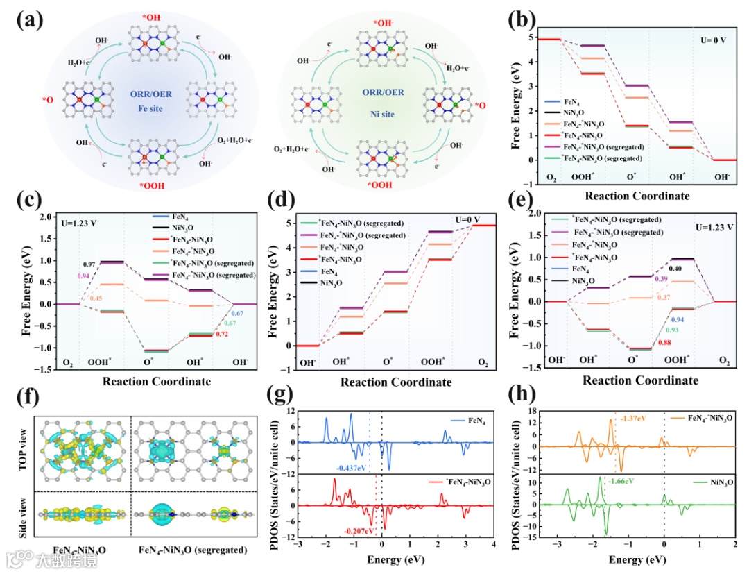 Fig. 5. a) ORR/OER reaction processes occurring at Fe and Ni sites in the FeN4-NiN3Omodel, b) ORR and d) OER free energy diagrams for all models at 0 V, c) ORR and e) OER free energy diagrams for all models at 1.23 V, f) Charge density difference of FeN4-NiN3Oand FeN4-NiN3O(segregated) (yellow and blue regions represent electron accumulation and depletion, respectively), g) Fe 3d partial density of states PDOS) for FeN4-NiN3Oand FeN4, h) Ni 3d PDOS for FeN4-NiN3Oand NiN3O.
