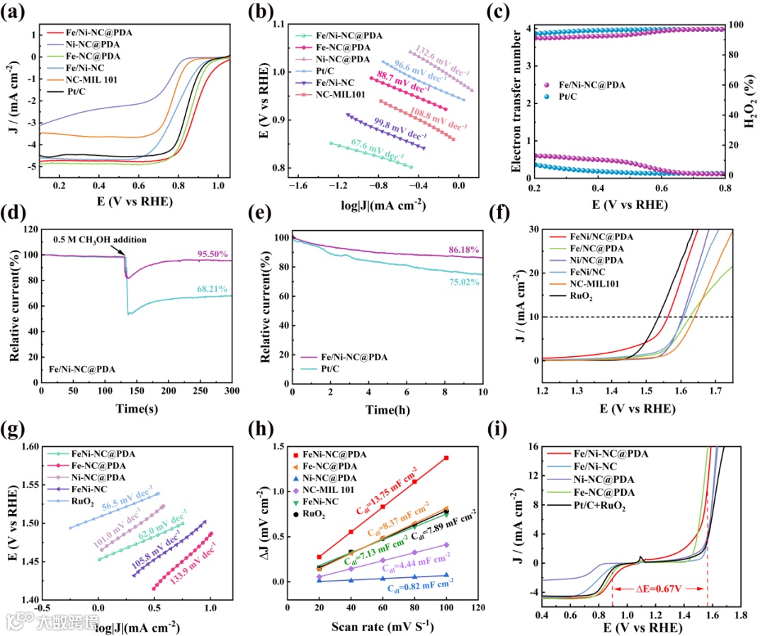 Fig. 3. a) ORR LSV curves at 1600 rpm for Fe/Ni-NC@PDA and other control catalysts. b) The corresponding Tafel plots obtained by the ORR LSV curves. c) H2O2 yield and electron transfer number of Fe/Ni-NC@PDA and Pt/C. d) Methanol tolerance curves of Fe/Ni-NC@PDA and Pt/C catalysts during the chronoamperometric test. e) Normalized chronoamperometry data of Fe/Ni-NC@PDA and Pt/C catalysts at 0.6 V versus RHE. f) OER polarization curves obtained in 1 m KOH electrolyte. g) Tafel plots obtained by the OER polarization curves. h) Cdl values for different catalysts. i) ΔE comparison of Fe/Ni-NC@PDA and other control catalysts.