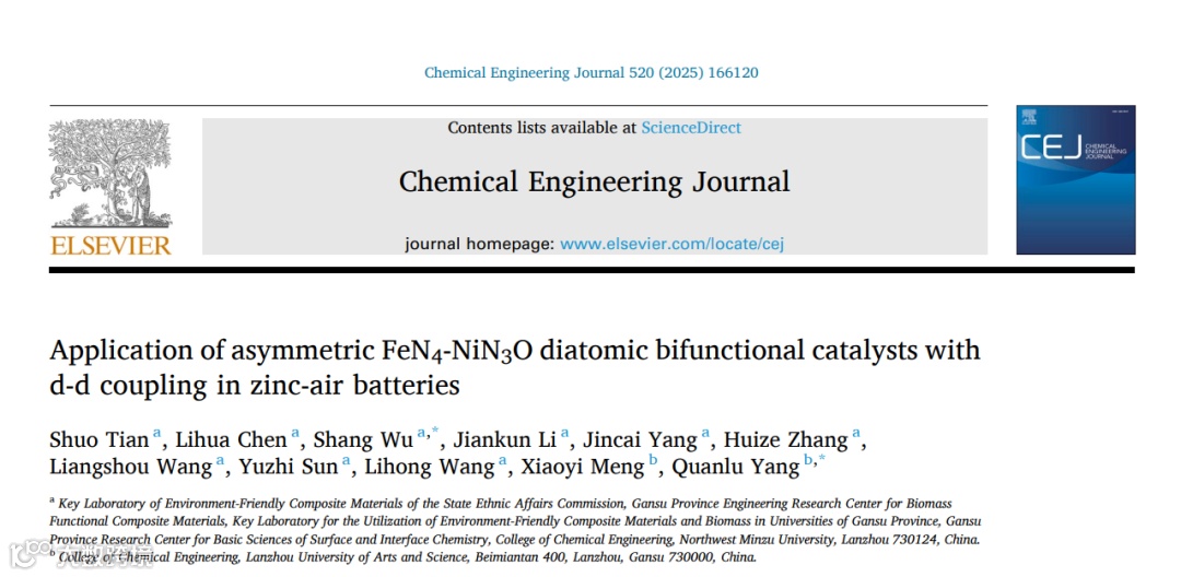 d-d耦合不对称FeN4- NiN3O双原子双功能催化剂在锌-空气电池中的应用