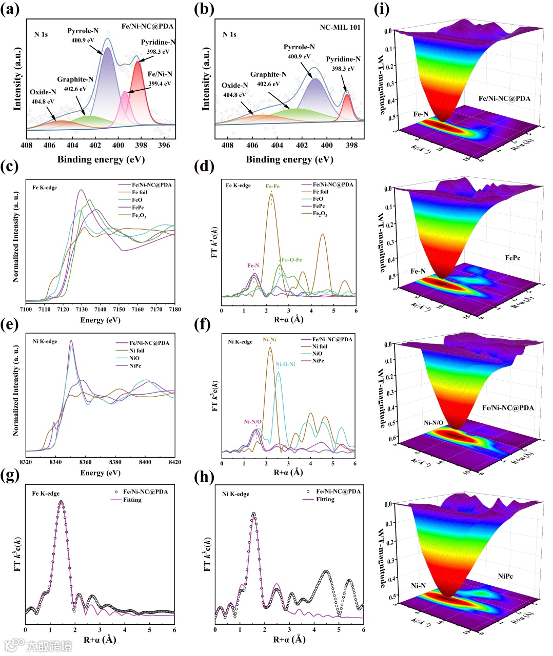 Fig. 2. N 1s XPS spectra of a) Fe/Ni-NC@PDA and b) NC-MIL101. c) Normalized XANES spectra of Fe/Ni-NC@PDA, FePc, Fe2O3 and Fe foil at Fe K-edge and d) Fourier-transformation of the corresponding Fe K-edge EXAFS spectra at R space. e) Normalized XANES spectra of Fe/Ni-NC@PDA, NiPc, NiO and Ni foil at Ni K-edge and f) Fourier-transformation ofthe corresponding Ni K-edge EXAFS spectra at R space. Fitting result of g) Fe K-edge FT-EXAFS and h) Ni K-edge FT-EXAFS. i) WT contour plots of Fe/Ni-NC@PDA, FePc, and NiPc.