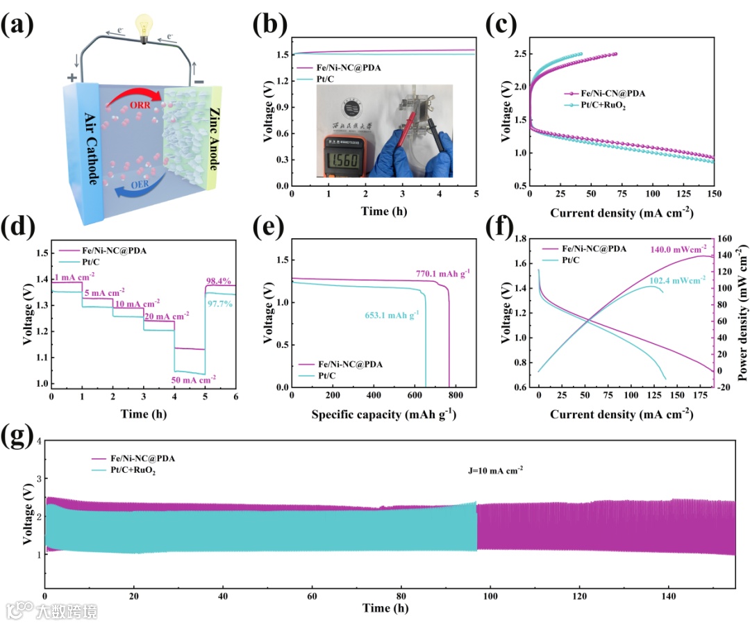 电化学测试表明 Fe/Ni-NC@PDA 催化剂在 ORR (E1/2 = 0.89V) 和 OER (Ej=10 = 1.56V) 中显示出优异的双功能催化性能,其电势差仅为 0.67V,优于商业 Pt/C + RuO2(ΔE=0.69V) 催化剂。由Fe/Ni-NC@PDA为阴极组装的锌空气电池的开路电压为1.56 V,还表现出比贵金属基 ZAB 更小的充电和放电电压间隙,在恒电流充放电循环测试中稳定循环了 156 小时,优于商业 Pt/C+RuO2催化剂,证明了其潜在的器件应用能力。